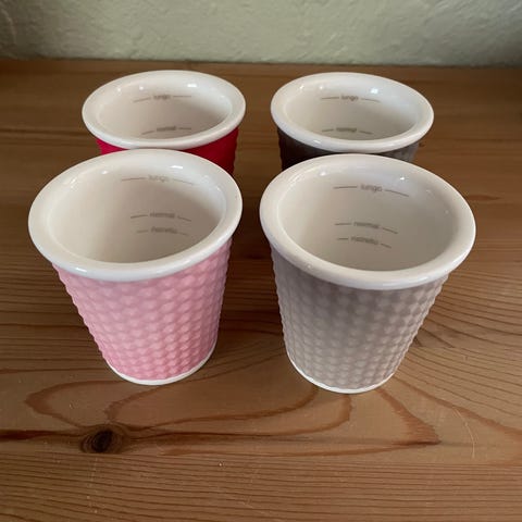 Milk & Coffee, Seks espressokopper fra italienske Andrea Fontebasso 1760 med festligt hønse-/påske-motiv. Opbevares i matchende “kagedåse”. Dåsen har brugsspor. Det har kopperne ikke.