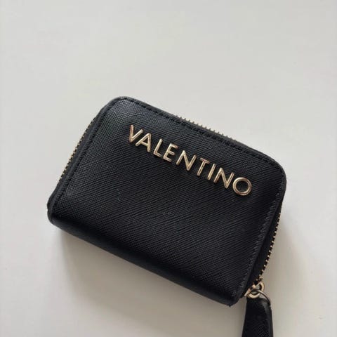 En sort pung med guldfarvet logo-print af mærket 'Viva Valentino'. Pungen har en foldet design med en synlig stikning samt et glat område ved lukningen. Målene for pungen er 14,5x10 cm, ideel til opbevaring af kort og kontanter.
