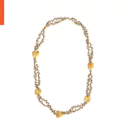 Halskæde lavet af små, runde skaller, der er bundet sammen med gennemsigtige snore. Halskæden har en længde på 44 cm og er lukket med en metalspænde. Den har en naturlig, flerfarvet skinnende effekt med primært brunlige nuancer.