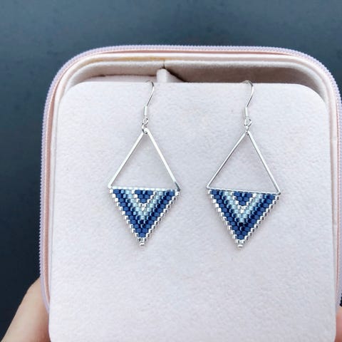 Et par øreringe formet som fiskekroge. De er lavet af metalsølvfarver og har en længde på 2,5 cm. Ørestikkerne bagpå sikrer, at de sidder godt på øret. Der er ingen tydelig branding eller mærke synligt på billederne.