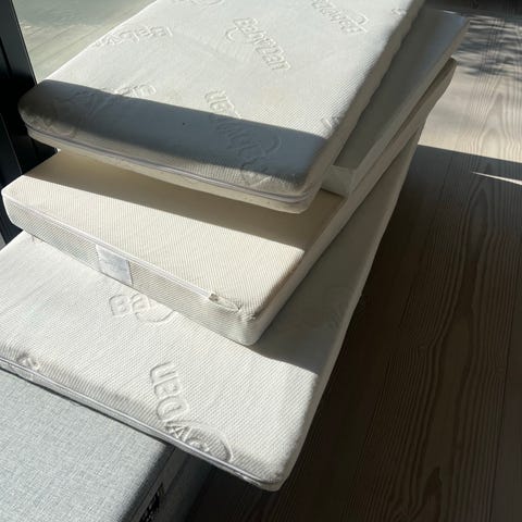 Str: 115 lang og 55 bred. Barne madras med sommer (bomuld) og vinterside (uld)