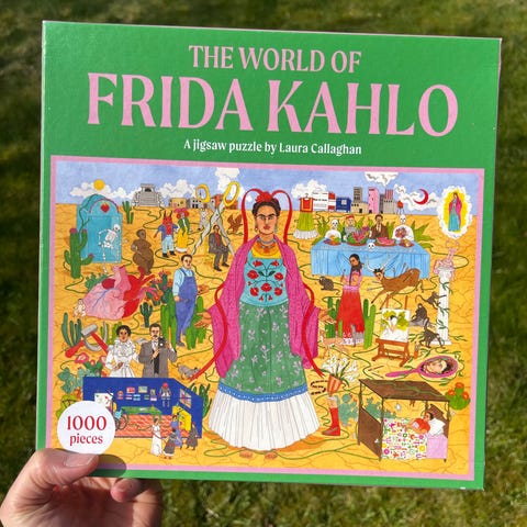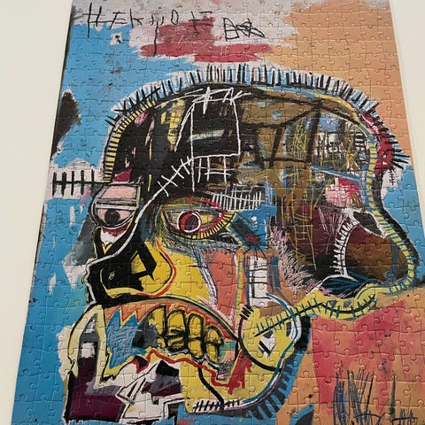 Puslespillet forestiller kunstværker af Yayoi Kusama og har et farverigt design med prikker og figurer.