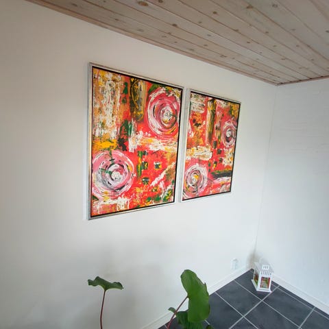 2 malerier, abstrakt komposition. akryl på lærred. Begge sign. Poul. 90 x 90 cm. Uindrammede.
