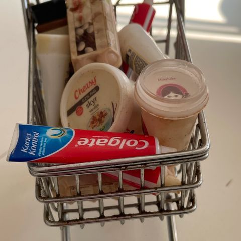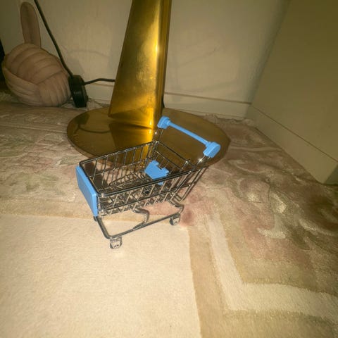 Dette er en miniature indkøbsvogn lavet af metal med et net-design. Vognen har fire små hjul og en håndtag for nem manøvrering. Den er ideel til dekoration eller leg og har en størrelse på 27x31 cm.