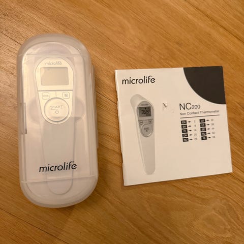 Dette er et Medisana infrarød termometer, model FTD, designet til at måle kroppens temperatur i øret og på panden. Den kan også anvendes til at vise rumtemperaturen samt klokkeslættet. Termometeret er kompakt i størrelsen med dimensionerne 10,5x2,5 cm, og der medfølger en brugsanvisning og original emballage, der er let beskadiget. Termometeret har en digital skærm på forsiden for nem læsning.