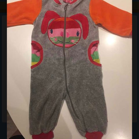 Denne heldragt har en blå base med forskellige farverige dyremotiver, herunder kaniner og andre figurer. Dragten har sorte ærmer og lukkes med en lynlås foran. På bagsiden er der et gult bjørneansigt broderet over bagdelen. Den er velegnet til små børn på grund af dens bløde materiale og sjove design.