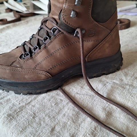 Disse sko er sorte vandrestøvler designet til kvinder. De har en længde på 26,5 cm. Skoene har snørelukning foran og en robust sål, der giver godt greb. Designet er enkelt og praktisk, hvilket gør dem velegnede til udendørs aktiviteter. Støvlerne har aldrig været brugt.