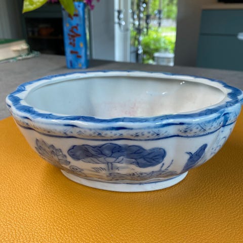 Denne ældre urtepotte er fra kina har et traditionelt blåt og hvidt motiv og mønster. Potten er designet med en enkelt hank, og dens dimensioner er 11cm høj og 24 cm i diameteren. Det indvendige af kummeren er lysegrønt, mens det ydre har et dekorativt blåt landskabsmønster. Bunden har et stempel, der indikerer mulig oprindelse. Tag: asiatisk porcelæn, blåt mønster
