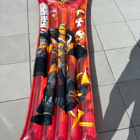 Billederne viser en blå luftmadras med tilhørende fodpumpe samt en papkasse. Luftmadrassen er foldet og har en ventil til oppustning. Der medfølger en fodpumpe med en fleksibel slange, der kan bruges til oppustning af madrassen. Papkassen, som var oprindeligt emballage til luftmadrassen, viser dimensionerne og illustrationer af produktet.