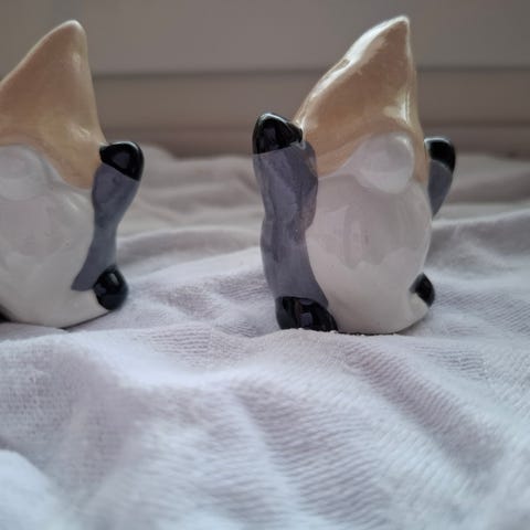 Sæt af to keramiske nissefigurer med glansfuld overflade. Figurerne er iført røde og grønne benklæder med stribede sokker. Den ene nisse holder en kop, mens den anden har en stjerne på maven. De er perfekte til dekoration i juletiden og har en samlet højde på 8 cm.