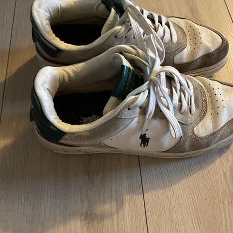 Et par hvide sko til børn, fremstilt af Polo. De har en tekstil overdel og gummisål, samt tre velcrolukninger foran for nem justering. Skoene har en stribet side detaljering og et Polo logo på hælen. Størrelsen er 32.
