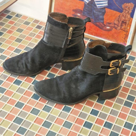 Dette er et par støvler med en blokhæle design, der har en størrelse 39. Støvlerne har en farvning bestående af grå, mørkeblå og sort, adskilt i geometriske sektioner langs skaftet. De er lavet i et ruskindsmateriale med en synlig lynlåslukning på siden for nem påtagning. Sålen er sort og solid, ideel til god fodgreb.