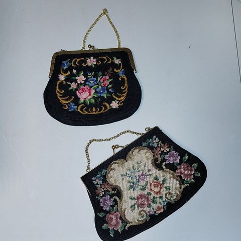Fin og charmerende broderet vintage taske fra ca. 1950-1960. Med blomstermotiv og metalramme og kæde. Meget velholdt. Tasken er foret med silke eller satin stof.