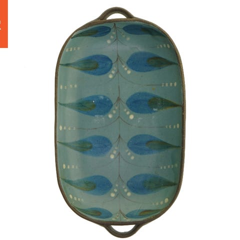 Dette er et keramisk fad med en størrelse på 18x14,5 cm. Fadet har et unikt håndmalet design, der viser to figurer og cykler på en lys baggrund med striber. Fadet har to små håndtag på hver side, der gør det nemmere at håndtere. Det har en brunlig farve med en rustik finish og et skrift på undersiden, der angiver oprindelse og årstal.