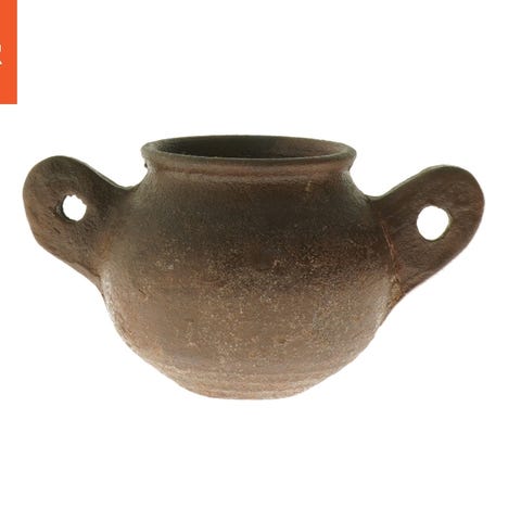 En dekorativ vase med en diameter på 15 cm. Vasen er lavet af keramik og har en rå tekstur med to håndtag på siderne. Den har en dyb grå farve med en lidt skrammet overflade, som giver den et rustikt look. Vasen kan bruges som en dekorativ genstand i hjemmet eller til at holde blomster og planter.