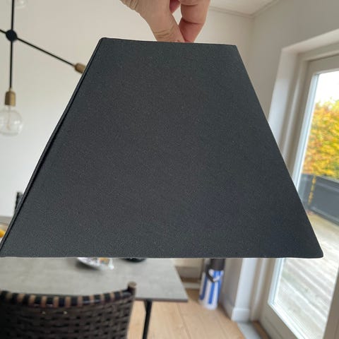 Dette er et par brune lampeskærme lavet af et materiale med en rustik tekstur. Hver skærm har en diameter på 18 cm. De er designet med en unik, håndlavet finish og en synlig metalramme indeni.