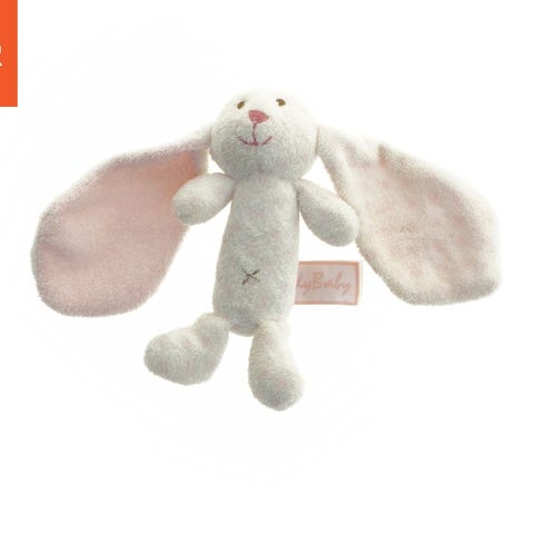 Denne baby bamse måler cirka 26 cm og er designet i et farverigt og muntert tema. Den har en sød ansigt med blå øjne og et smil. Bamsen er klædt i en kostume-liknende outfit med sorte og røde prikker og bærer matchende sko i grøn og lilla. Den har to arme, der holder ringformede rangler i gule, blå, orange og lilla farver, ideel til at stimulere barnets sanser og motorik. Der er også en hvid plast krog på toppen, så den nemt kan hænges op i barnevognen eller krybbens kant for nem adgang. Tag: legetøj, baby, bamse, rangle
