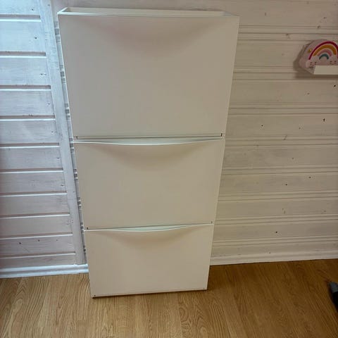 Skabet har tre vippelåger med god opbevaringsplads til sko samt et åbent rum øverst, ideelt til nøgler, handsker eller andet tilbehør.