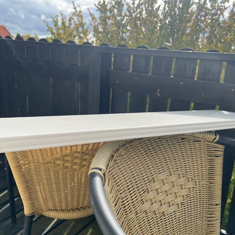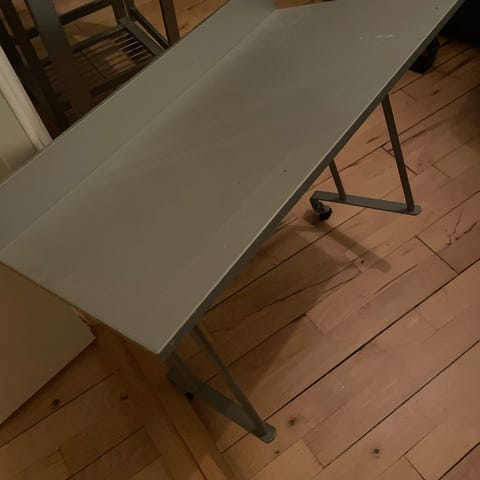 IKEA skrivebordshylde i hvid farve. Designet til at placeres på skrivebordet for ekstra opbevarings- eller arbejdsplads. Fremstillet i materialer, der passer til almindelige kontormiljøer.