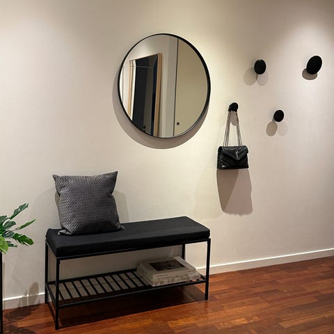 Jysk Marstal rundt spejl med sort ramme. Spejlet har en enkel og tidløs rund form, der kan bruges i forskellige rum som entré, badeværelse eller stue. Materialet og farven gør det let at integrere i forskellige indretningstyper.