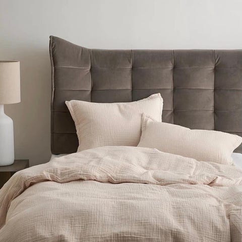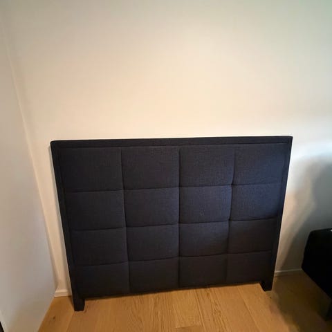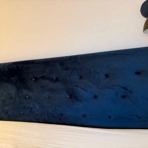 Ellos sengegavl i gråt velour look og fine knapdetaljer. Gavlen er designet til at placeres bag sengen som en dekorativ og funktionel løsning. Superblødt materiale