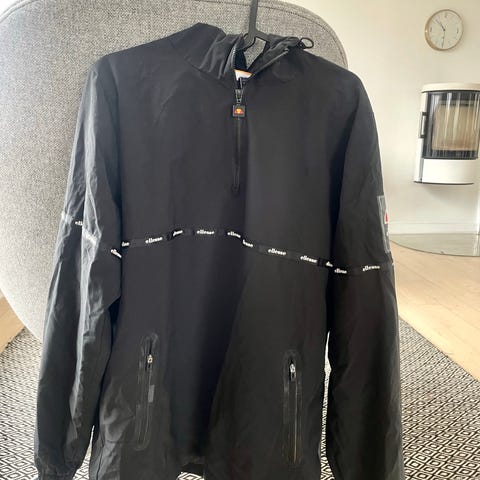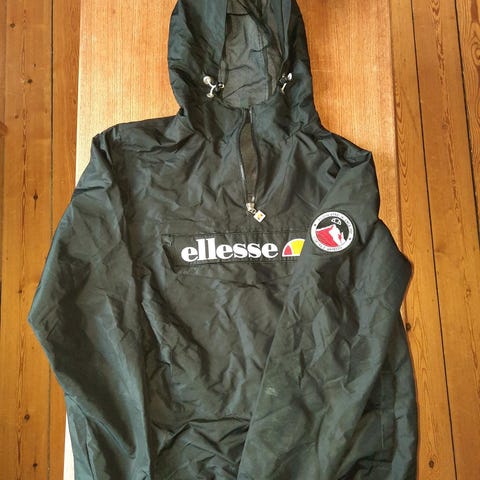 Ellesse jakke/windbreaker/anorak i sort, størrelse S. Fremstillet i polyester materiale og er vandafvisende. Jakken har hætte og logo på front og ærmer. Brugt én gang. Røgfrit hjem, heller ej husdyr