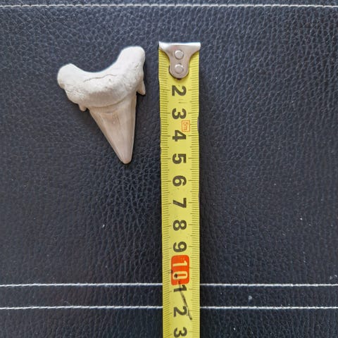 Flot hajtand fra en Tyrehaj. Fine savtakker.