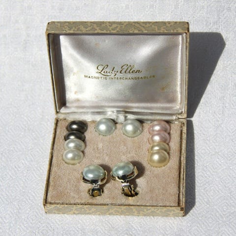 Virkelig smart løsning fra firserne, flotte magnetiske øreclips og ikke mindre end 12 forskellige domes at skifte imellem. Genialt til ferier. De er ikke signerede, men kunne være fra Kenneth Jay Lane. Æsken er en jeg har fundet, som passer til hele samlingen. Måler 2,5 cm i diameter.