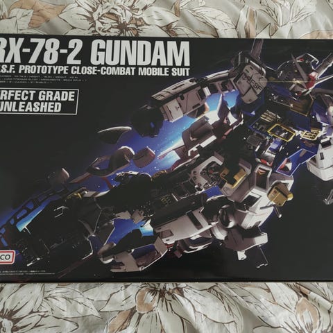 Bandai RX-78-2 Gundam modelbyggesæt med flere plastdele til samling. Indeholder instruktioner og forskellige komponenter til at bygge Gundam-figuren.