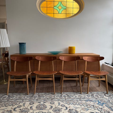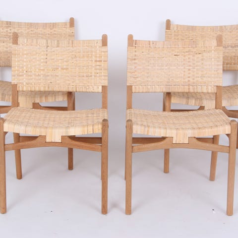 Prisen er 4800 kr pr stk som de står, de kan bestilles ny slebet og ompolstret for en mere pris på 1800 kr pr stol.