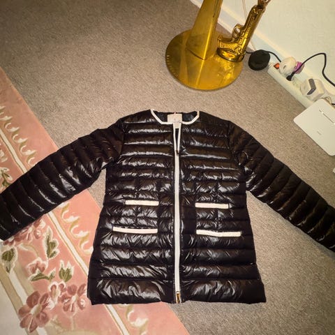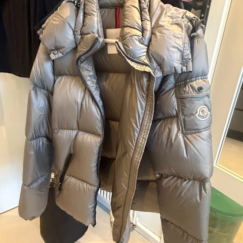 Moncler Vinterjakke i sort farve, størrelse M til kvinder. Jakken er fyldt med dun, hvilket giver isolering og varme. Designet med hætte, der har pelskant, og jakken er velegnet til vinterbrug.