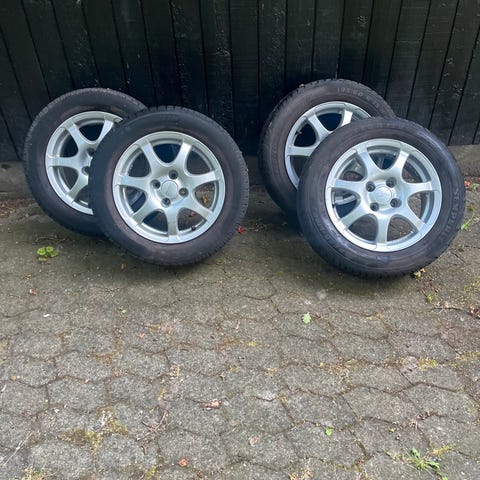 4 stk alufælge med sommerdæk; gammel DOT- dæk; købt nye fra lager i 2023 og kørt til og med sommer 2025. Stadig bløde og uden tegn på revner. Er runde og ruller fint. 2 Michelin og 2 Barum monteret. 6-7 mm slidbane på alle 4.