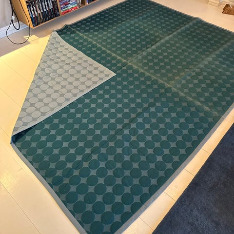 Hay tæppe i rund form med flerfarvede kugler. Tæppet er lavet af tekstilmateriale og har en farverig sammensætning. Velegnet til brug som gulvbelægning i forskellige rum.