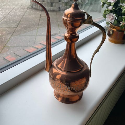 Kobber kande med 6 kobber spyd roser håndlavet først i 1980 som bryllupsgave -kobberbryllup yndig dekoreret se billedet fra dengang der var levende blomster i men kan jo også dekoreres med kunstige blomster