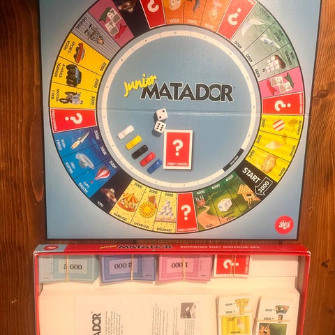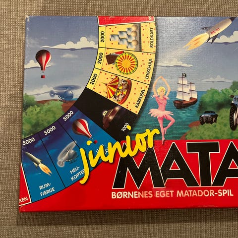 Børnevenlig version af det klassiske Matador, hvor de mindste kan købe ejendomme, tjene penge og lære at handle. Dansk. Æsken har lidt slid, men indholdwt er i fin stand.