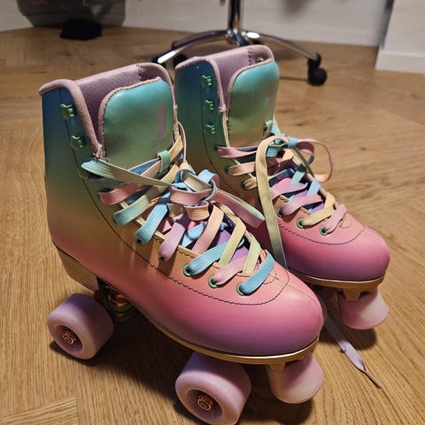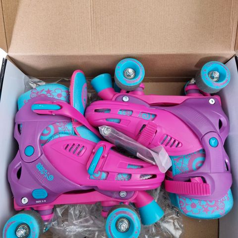 Her er et komplet sæt rulleskøjter med beskyttere Str 33-37