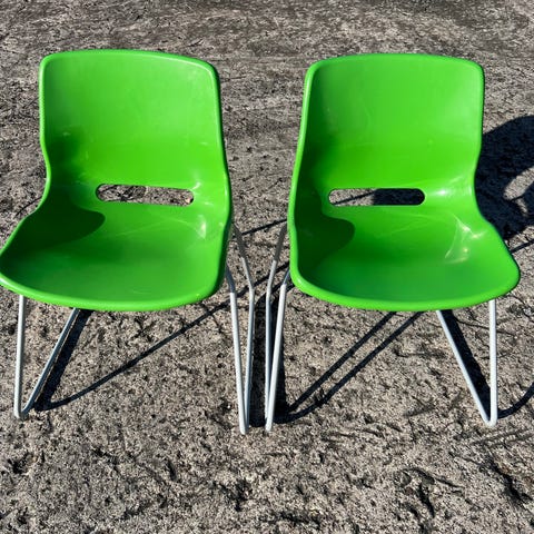 Fine spisebordsstole i plastik fra imerco ca 2019. Lyseblå og støvet grøn.