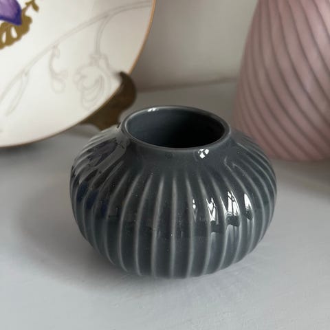 Kähler fyrfadsstager i grøn keramik med rillede detaljer. Højde cirka 11 cm. Lidt spor efter stearin, men ellers ingen skader eller brugstegn udadtil