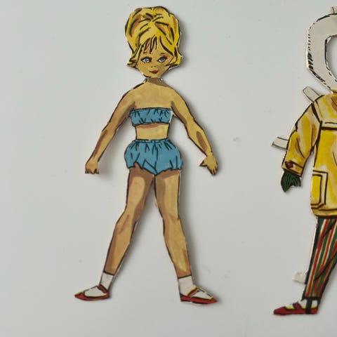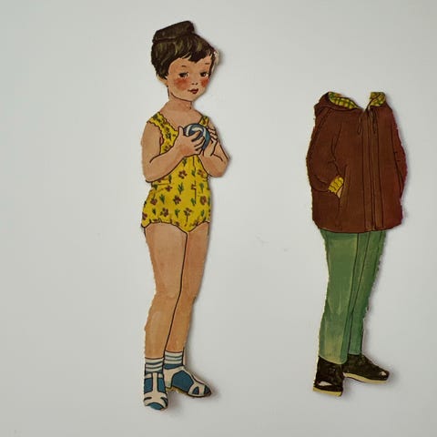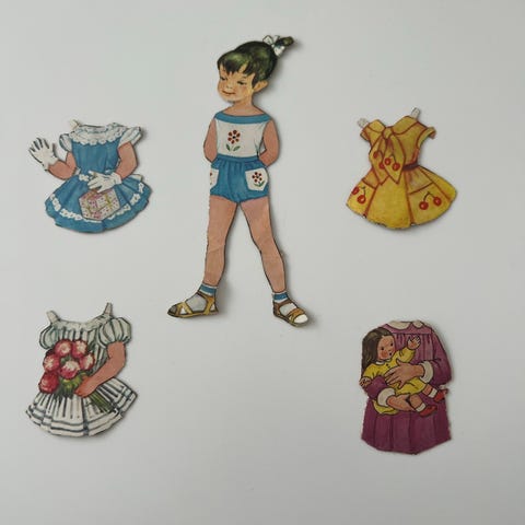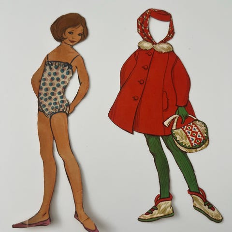 Papfigur af en pige med tilhørende tøj i papir, herunder kjoler, frakke og hat i forskellige farver og mønstre. Figuren og tøjet kan anvendes til leg eller dekoration.