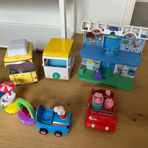 Gurli Gris legehus med flere etager og tilhørende figurer. Indeholder møbler såsom bord, stol, badekar og køkkenudstyr samt forskellige Gurli Gris figurer og legetøj som tog og bil. Legehuset er designet til børn og giver mulighed for fantasifuld leg med kendte karakterer fra Gurli Gris universet.