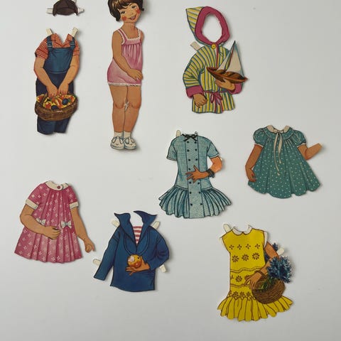 Sæt af vintage papirdukker med tilhørende tøj til udklip i forskellige farver og mønstre. Materialet er papir, og produkterne er velegnede til samling eller kreativ leg.