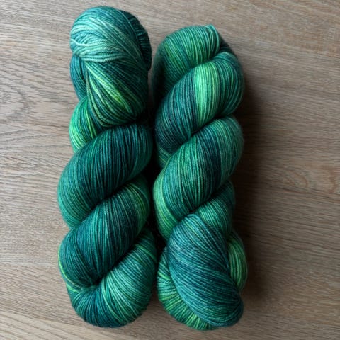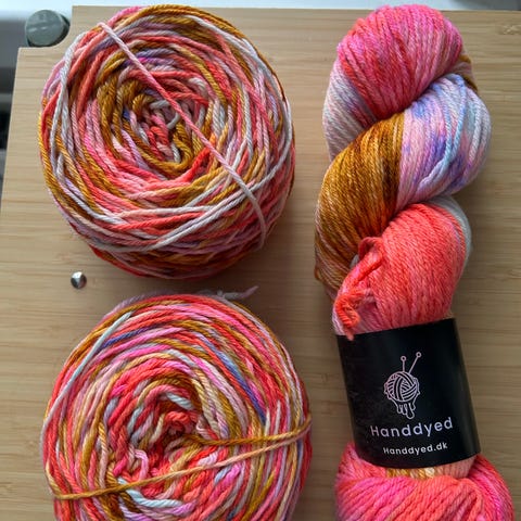 To nøgler håndfarvet merino fra Ladybug Yarn. De er vundet op men har ikke været strikket. Hvert fed er ca 100 g, løbelængde: 800 m pr. 100 g