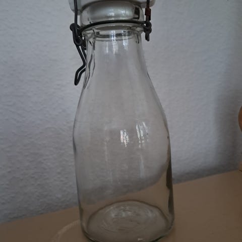 Smukkeste lille glasflaske med prop i kraftigt glas. Er af antik dato.