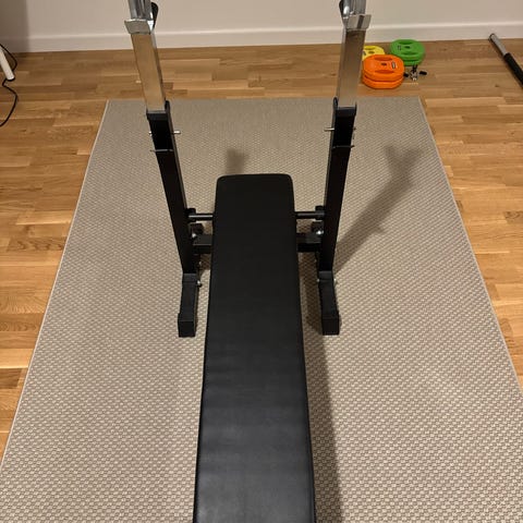 Træningsbænk med integreret stativ til vægtløftning. Bænken har polstret overflade for komfort under træning og er designet til styrketræning og vægtløftningsøvelser.