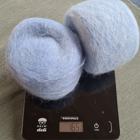 By Emra Silk Mohair garn med 72% Kid Mohair og 28% silke. Hver nøgle vejer 50 gram og indeholder 420 meter garn. Det tredje fed er vundet op men har ikke været strikket