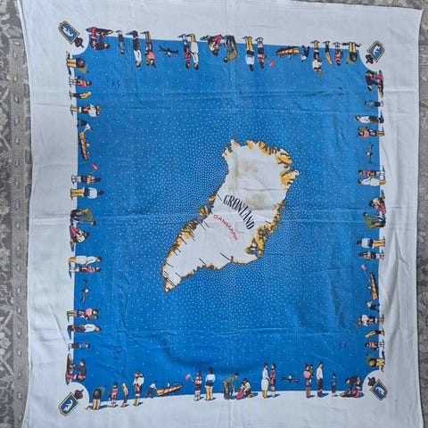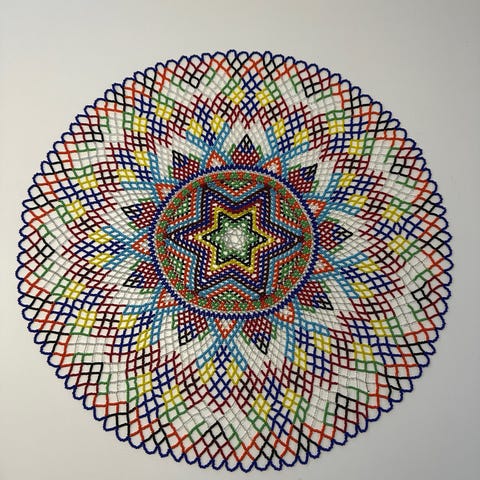 Sælger denne imponerende, håndlavede grønlandske perledug i en sjælden ottekantet form. Dugen er et fantastisk stykke kunsthåndværk med et komplekst geometrisk mønster og et væld af klare farver.