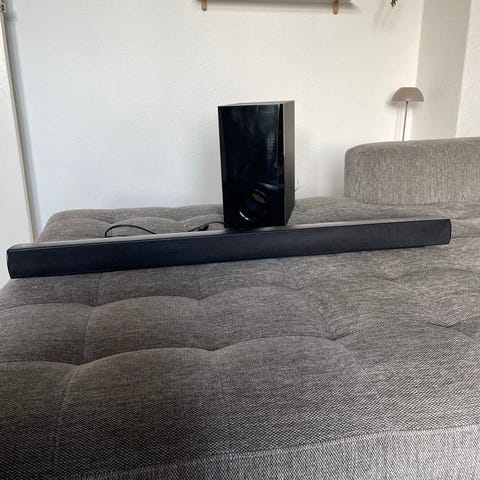 LG Soundbar med tilhørende subwoofer og fjernbetjening. Enhed til lydforbedring, der kan tilsluttes til tv eller andre lydkilder.