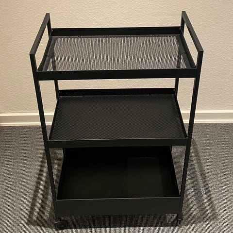 Sort rullebord i sort metal. Det mangler en enkelt skrue v/den øverste hylde, men det har ingen betydning for funktionen. Pris sat derefter.