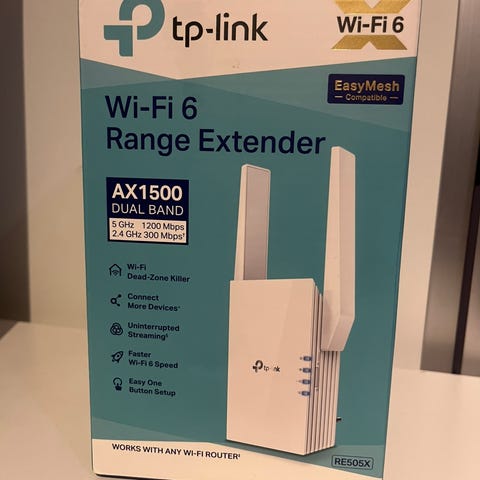 TP-Link Archer Air E5 WiFi 6 Repeater AX3000. Enhed til forlængelse af WiFi-signal og forbedring af dækning i hjemmet. Understøtter WiFi 6 og er kompatibel med standard routere/netværksudstyr. Sælges helt ny og ubrugt i original emballage (aldrig taget i brug).