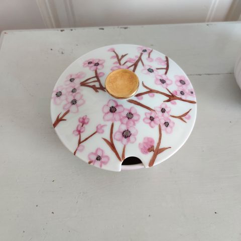 sukkerskål og fad i porcelæn med håndmalet blomsterdekor og guldkant. Sukkerskålen har låg og to håndtag, fadet har to udskårne håndtag. Produkterne er dekoreret med naturtro blomster i afdæmpede farver.